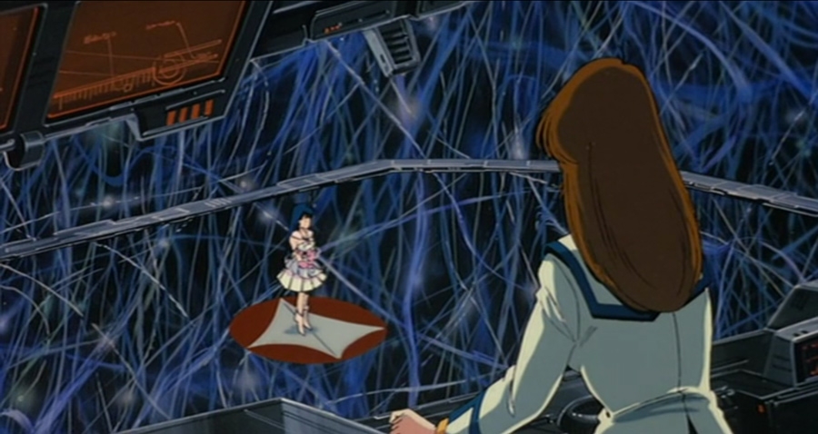After much deliberation, the pilot chooses Misa, but there’s no time for romance! An impending attack from the Zentradi aliens requires two parts of an alien song — melody from Minmay and translated lyrics from Misa — to be combined to confuse and disarm their culture-deprived assailants.